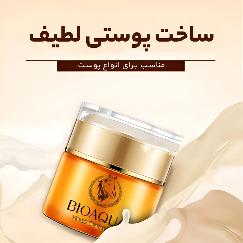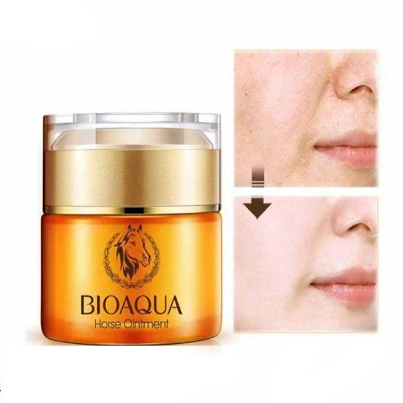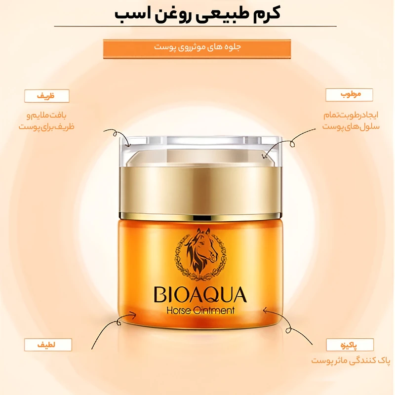 کرم روغن اسب بیواکوا BIOAQUA Horse Ointment یک محصول چند کاره ساخت کشور چین می باشد که شما را در رسیدن به پوستی سالم و صاف یاری می کند. کرم معجزه گر روغن اسب محصولی ارگانیک می باشد که توسط یکی از معتبرترین شرکت های تولید کننده لوازم آرایشی بهداشتی یعنی بیواکوا تولید شده است.این محصول را شما می توانید برای روشن تر و درخشان شدن پوست خود مورد استفاده قرار دهید و از نتیجه آن شگفت زده شوید. این محصول یک کرم آبرسان و مرطوب کننده نیز می باشد که می تواند رطوبت از دست رفته پوست شما را بازگرداند.تحریک و افزایش کلاژن سازی از دیگر ویژگی های این کرم معجزه گر است که نتیجه آن جوانسازی پوست است. علاوه بر کلاژن سازی، به دلیل تحریک شدن مویرگ های زیر پوست جریان خون افزایش یافته و مواد مغذی بیشتری به پوست می رسد تا پوست مقاوت و جوانی خود را به دست آورد.